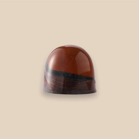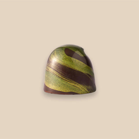 De ganache is verrijkt met Bronte-pistachenoten. Deze bijzondere pistachenoten, geteeld in de vruchtbare vulkanische grond rond Bronte, een pittoresk dorp aan de voet van de Etna. Ze staan bekend om hun zoet-zoute smaak, vlezige textuur en smaragdgroene kleur, wat ze het label “groen goud” heeft opgeleverd. De passievrucht, met zijn unieke zoet-zuur smaak en verfrissende aroma, versterkt de complexiteit van de bonbon.